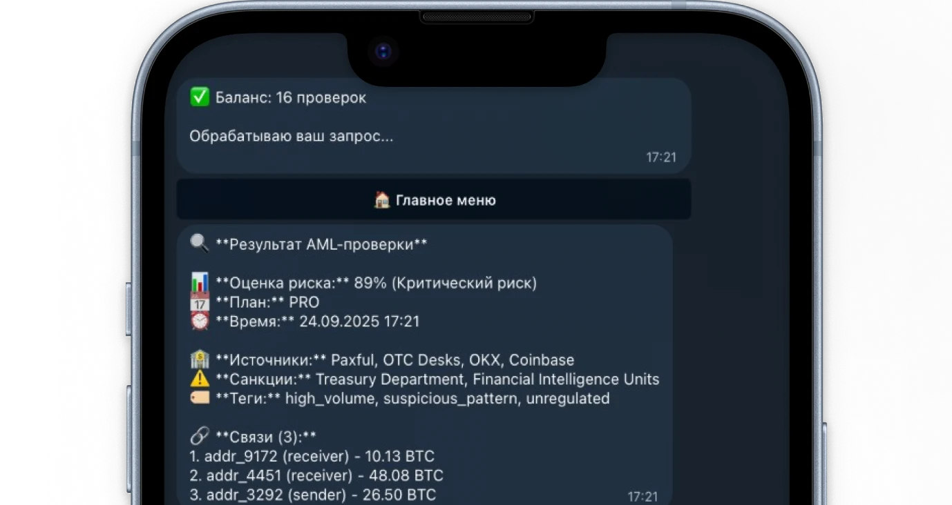 AMLbot verification displays a risk score (if available), threat sources, and whether the address is blacklisted. The report can also display the cluster, balance, and transaction volume. For some blockchains, data is limited, and the risk score is calculated only for clustered entities. If the information is missing, this does not guarantee that the address is “clean” – the data is simply not currently available.